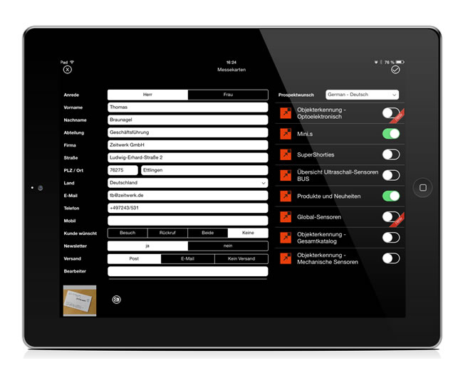 Neben der attraktiven Produkt- und Unternehmenspräsentation ermöglicht die Sales-App eine Kundendirektanfrage an Ihr Unternehmen – diese wird als Lead sofort erfasst und in den Vertriebsprozess ohne Medienbruch integriert.